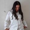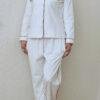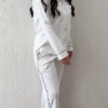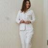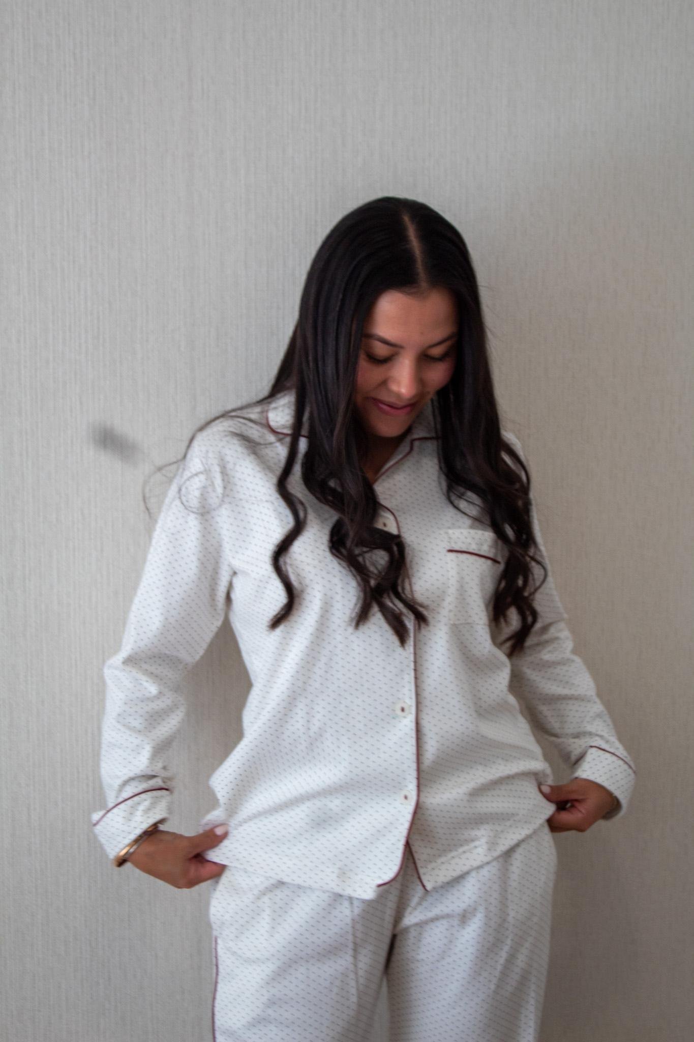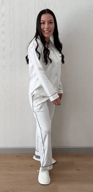 Pijama camisera confeccionada en suave algodón color perla, que brinda una sensación agradable al contacto con la piel. Presenta un estampado delicado de pequeños puntos oscuros que contrastan sutilmente, aportando un toque clásico y sofisticado. Su diseño incluye botones frontales y un corte cómodo, perfecto para descansar con estilo sin renunciar a la comodidad.